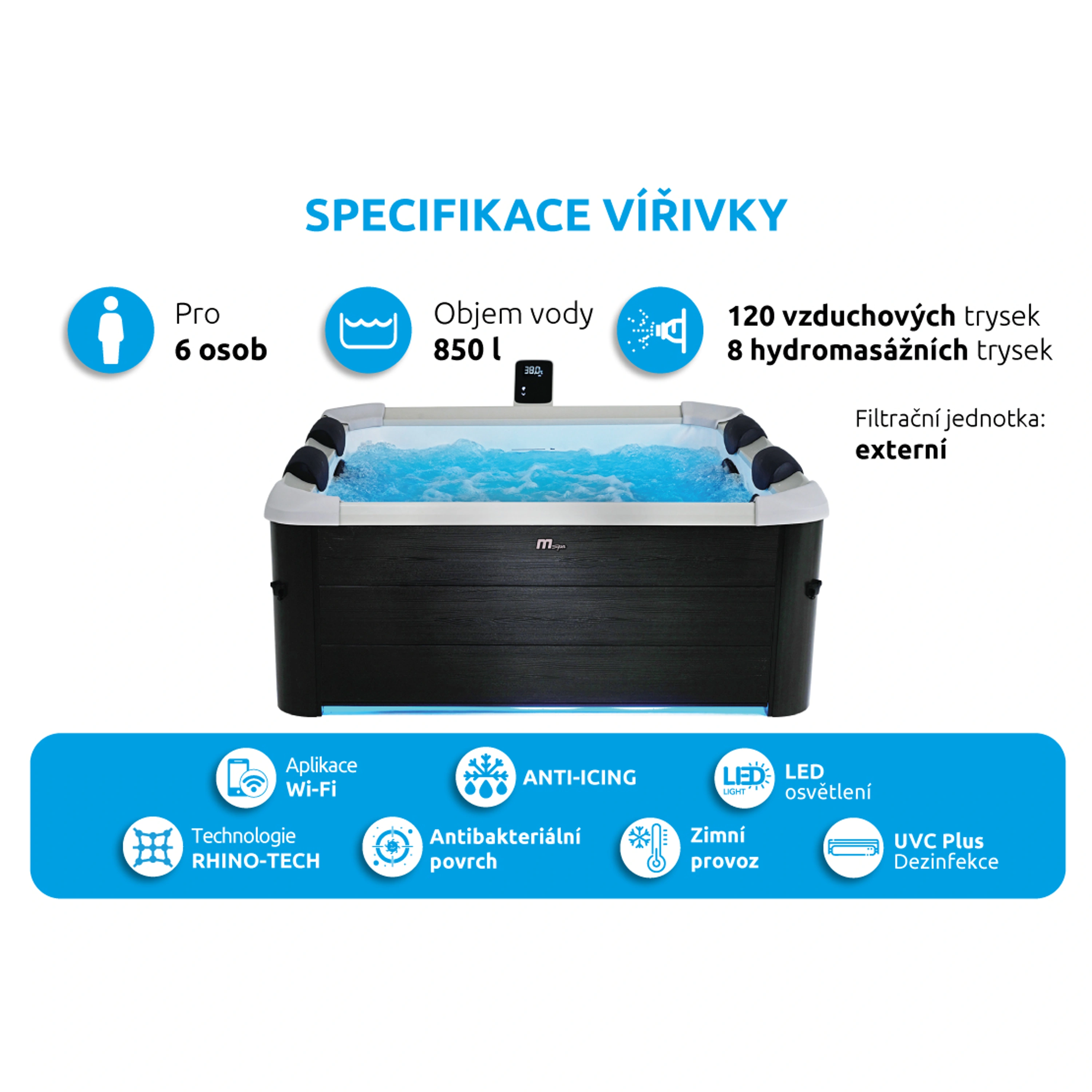 - Trysky: 120 vzduchových + 8 nastavitelných hydromasážních trysek