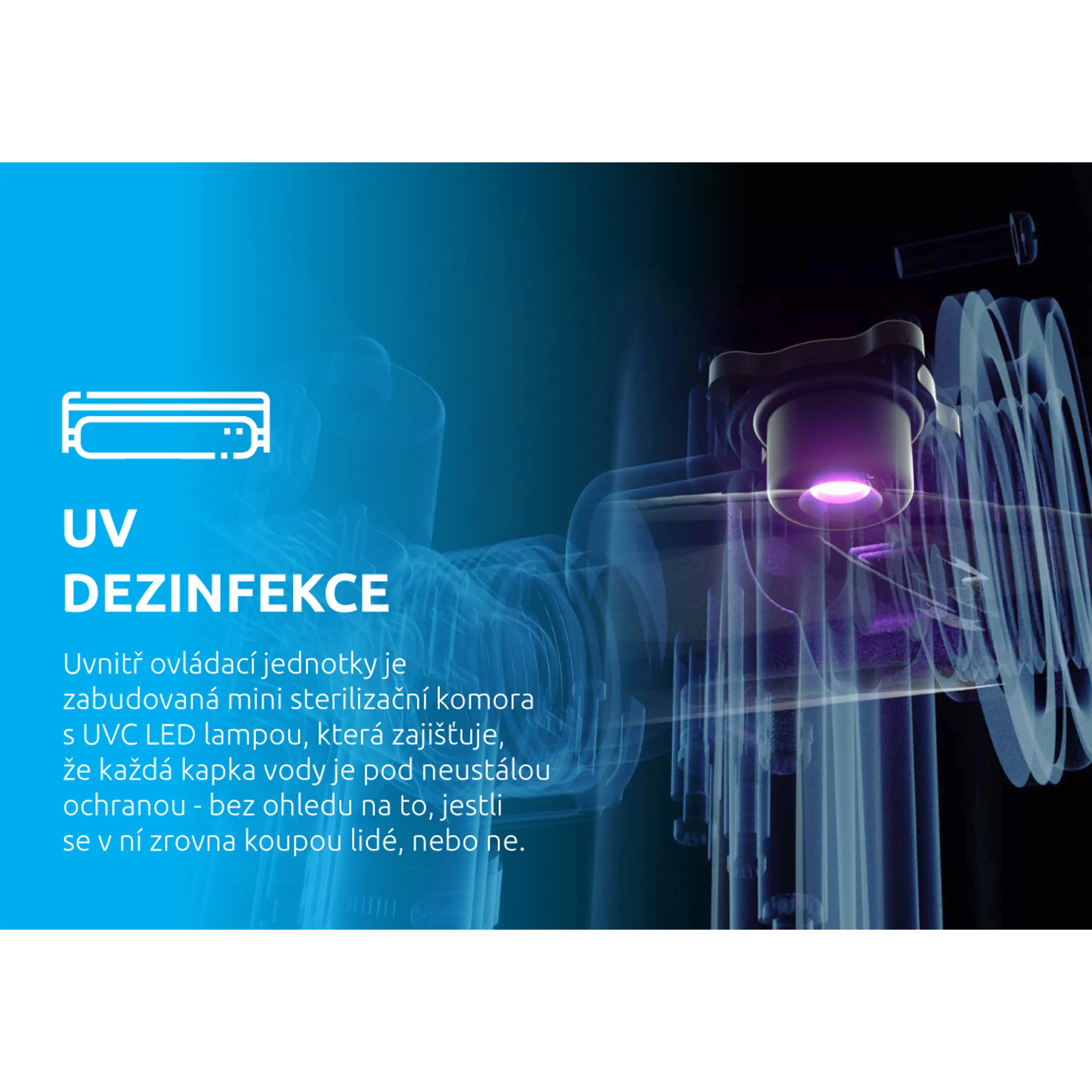 Uvnitř ovládací jednotky je zabudovaná mini sterilizační komora s UVC LED lampou, která zajišťuje, že každá kapka vody v Mspa je pod neustálou ochranou - bez ohledu na to, jestli se v ní zrovna koupou lidé nebo ne. Testy ukazují, že tato lampa dokáže za 4 hodiny zahubit 52% bakterií. UV LED lampa nemůže poškodit vaše oči ani pokožku, jelikož je kompletně uzavřena uvnitř čerpadla. Narozdíl od UVA nebo UVB záření UVC nemá vliv na životnost. Vlnová délka UVC záření je pečlivě nastavena tak. aby neovlivnila životnost ostatních částí vany. Spotřeba tohoto UVC systému je velice nízká.