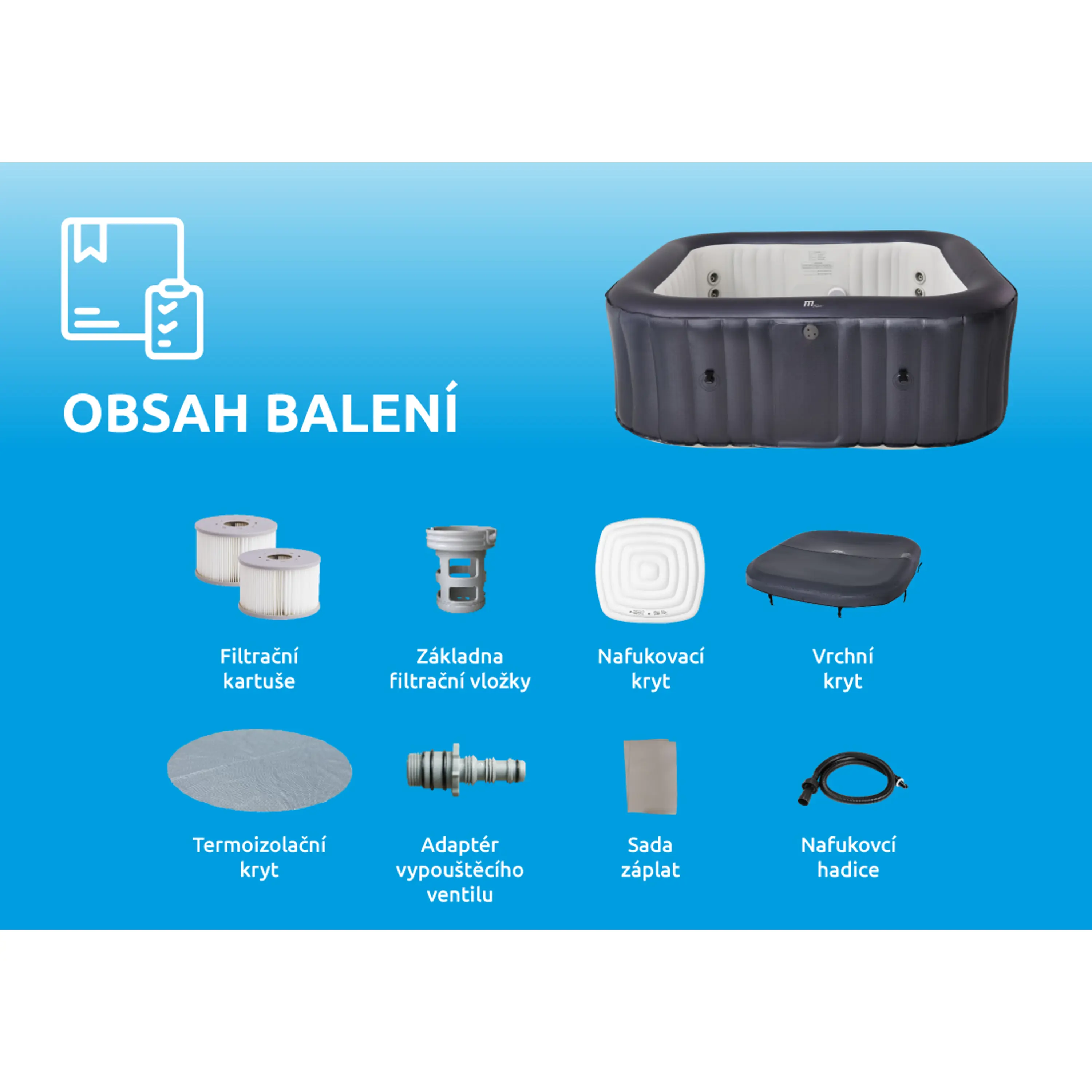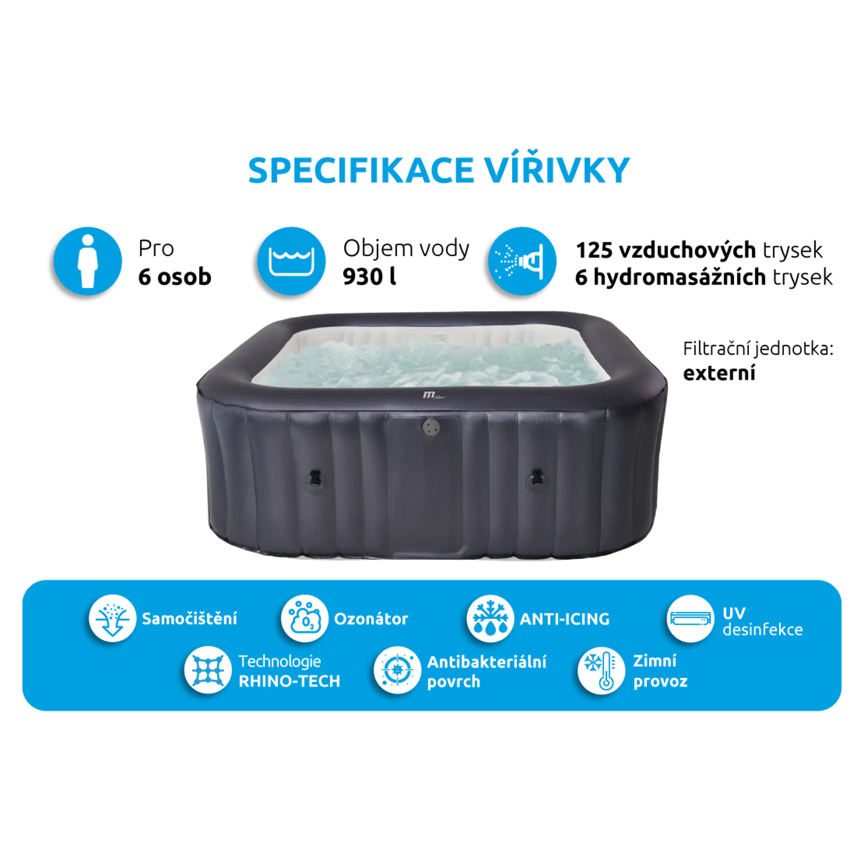 Čtvercová nafukovací vířivka MSPA Otium M-OT062 má krom vzduchových trysek navíc 6 hydromasážních trysek, které nabízejí osvěžující masáž s nastavitelným směrem a úrovní tlaku. Do této vířivky se pohodlně vejde až 6 osob. Výhodou je například systém rychlého ohřevu na 40 stupňů, proměnlivá rychlost bublinek, UVC technologie, časovač pro úsporu energie, inteligentní filtrační systém či protiskluzové dno.