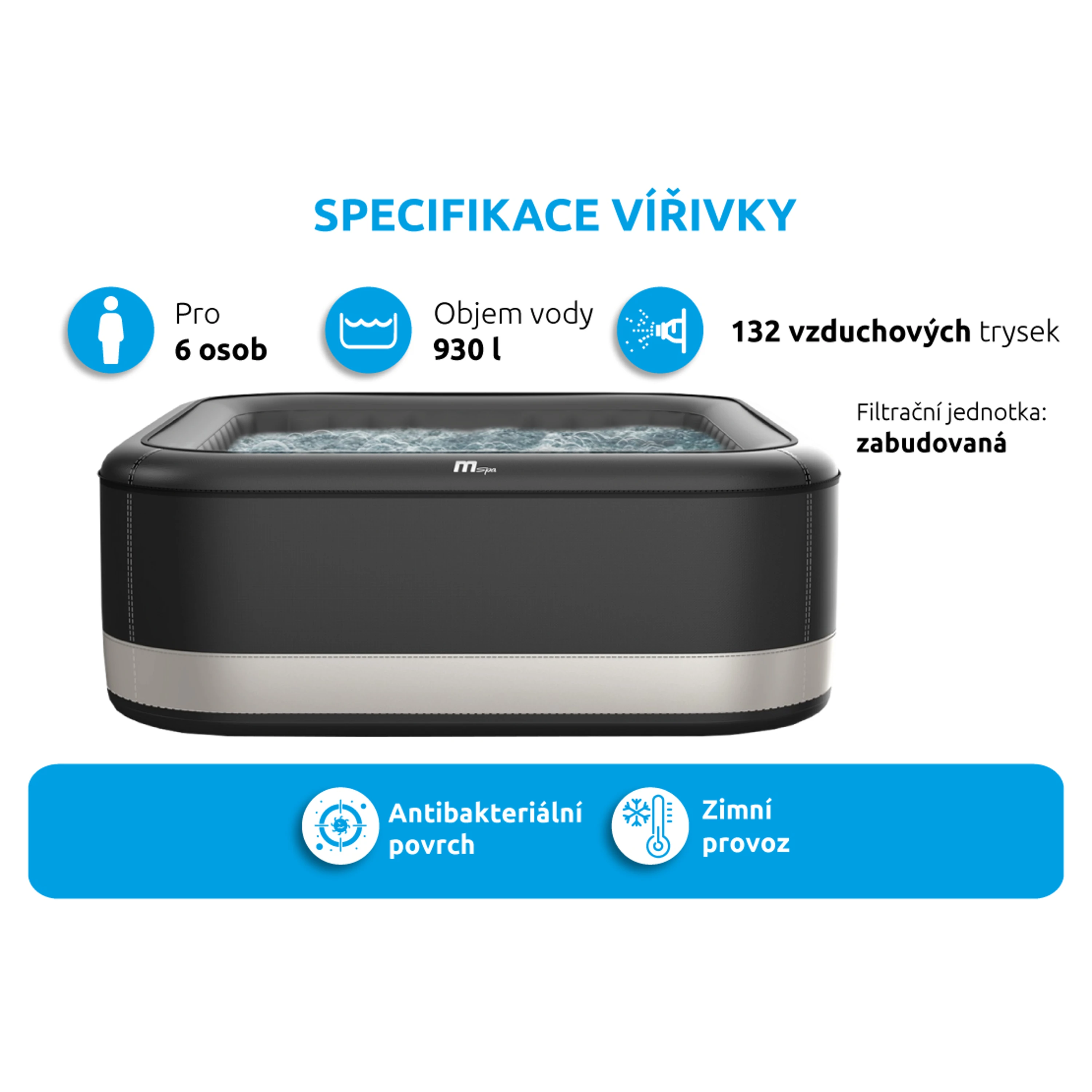 Vnitřní folie vířivé vany obsahuje antibakteriální tkaninu, která uvolňuje baktericidní složku, která v souladu s ISO 22196:2011 standardem snižuje množení bakterií o 99%.