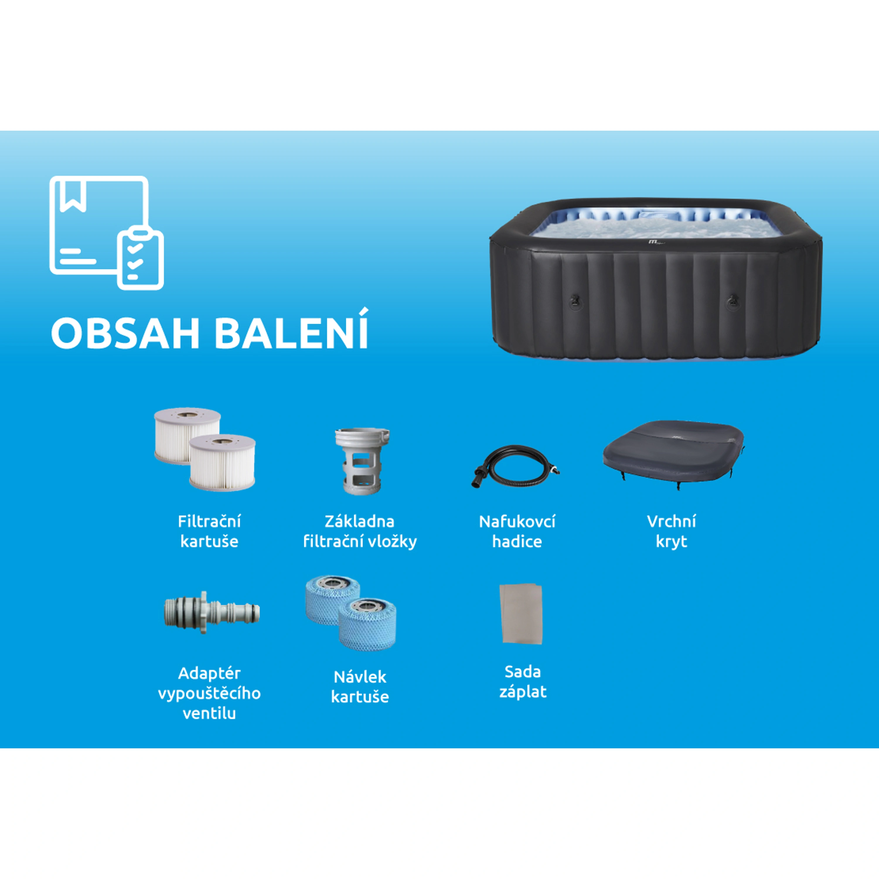 Výhodou je 132 vzduchových trysek a účinný ohřev vody. Uvnitř ovládací jednotky je zabudovaná mini sterilizační komora s UV LED lampou, která zajišťuje, že každá kapka vody v Mspa je pod neustálou ochranou.