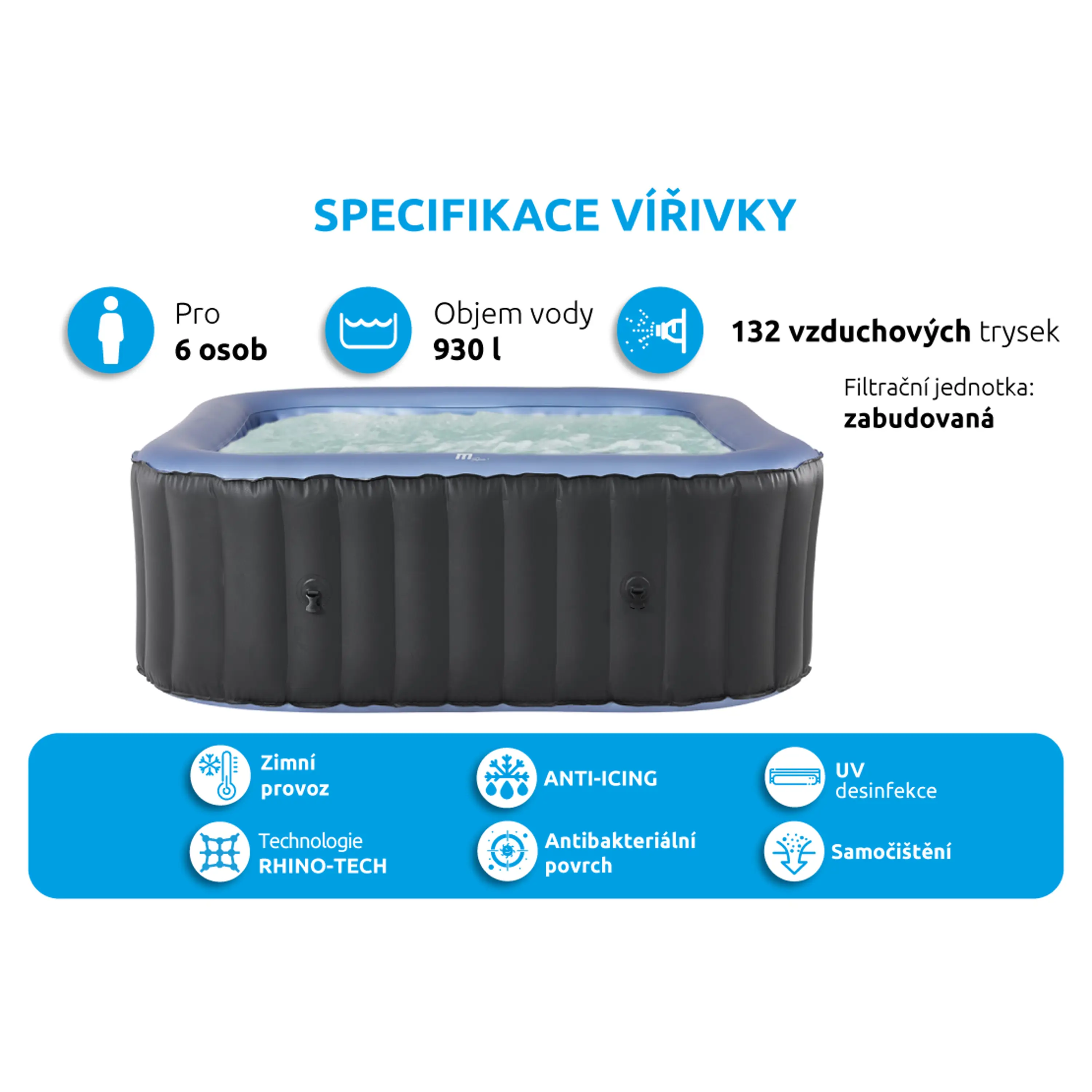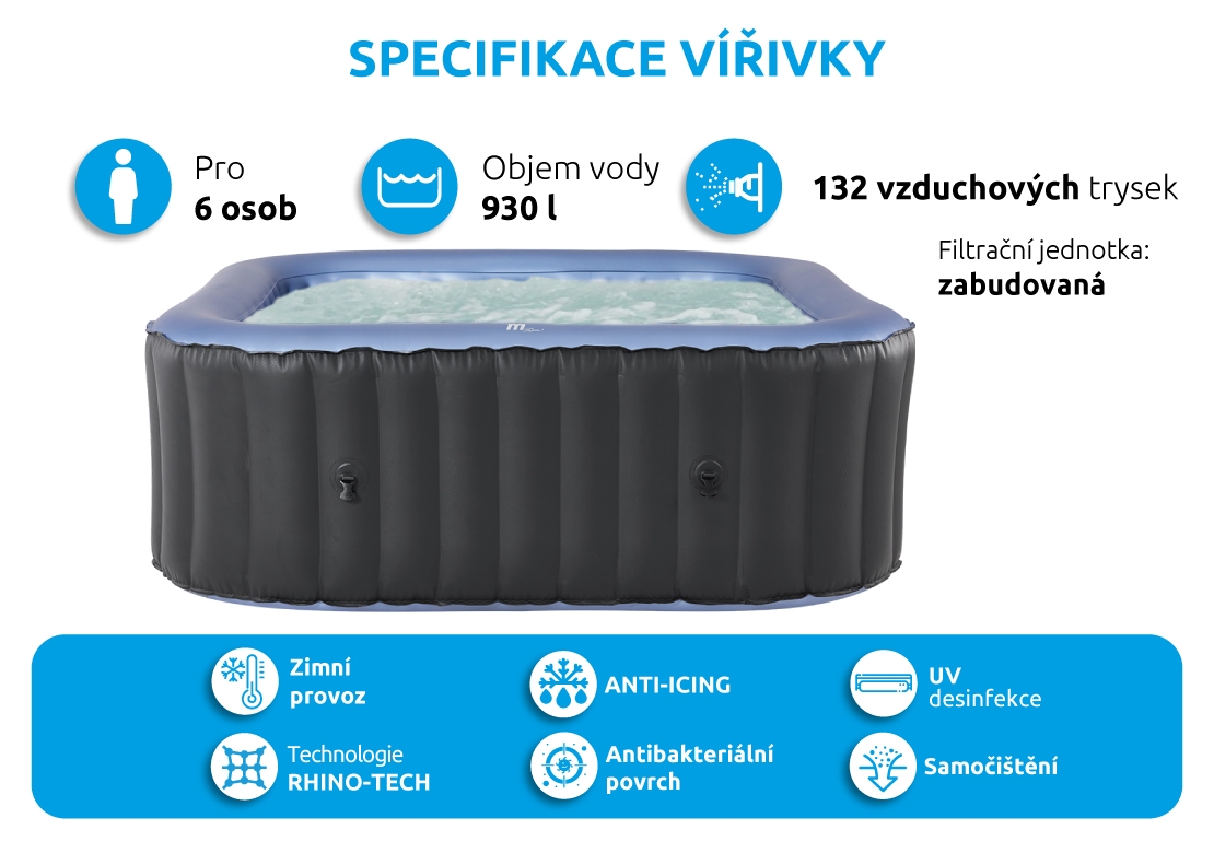 Výhodou je 132 vzduchových trysek a účinný ohřev vody. Uvnitř ovládací jednotky je zabudovaná mini sterilizační komora s UV LED lampou, která zajišťuje, že každá kapka vody v Mspa je pod neustálou ochranou.