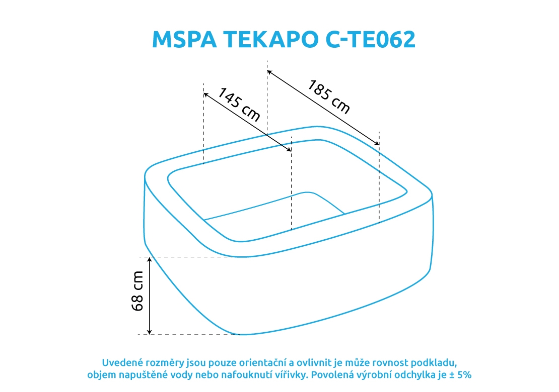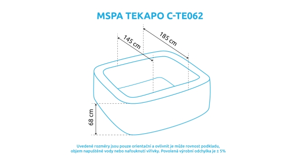 - Vnější rozměry: 185 x 185 cm (po naplnění vodou, tolerance ± 5%)