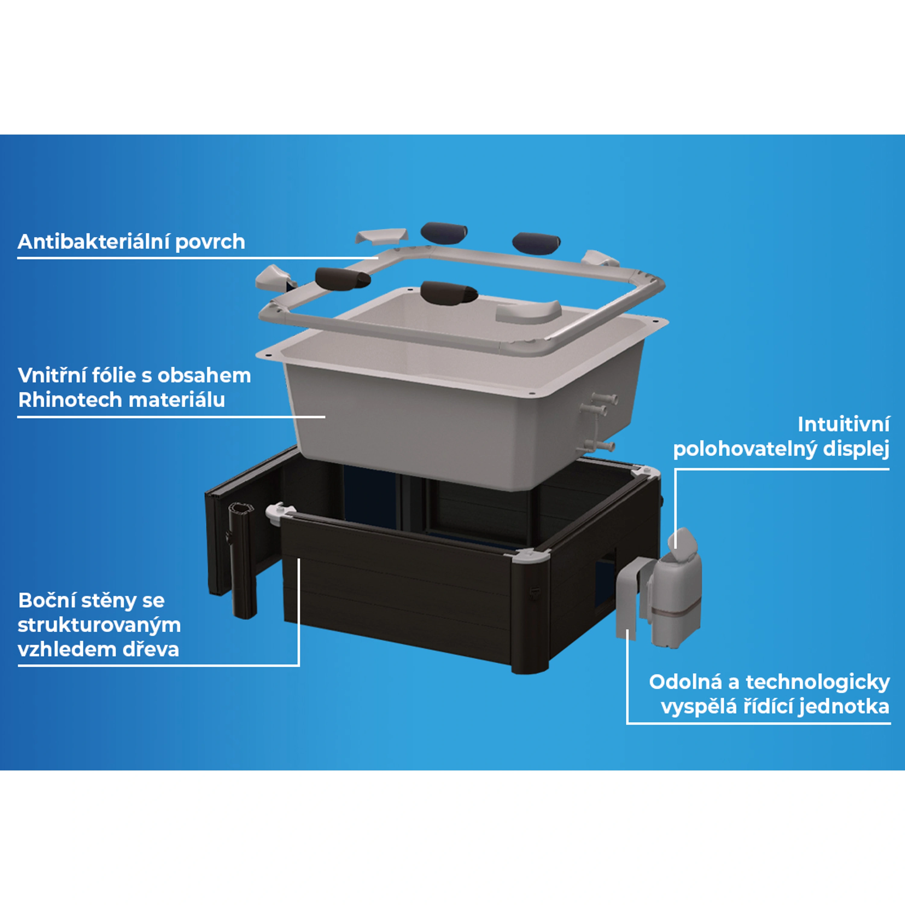 - Materiál vany: dřevoplast + vnitřní RhinoTech prémiová PVC folie s antibakteriální úpravou