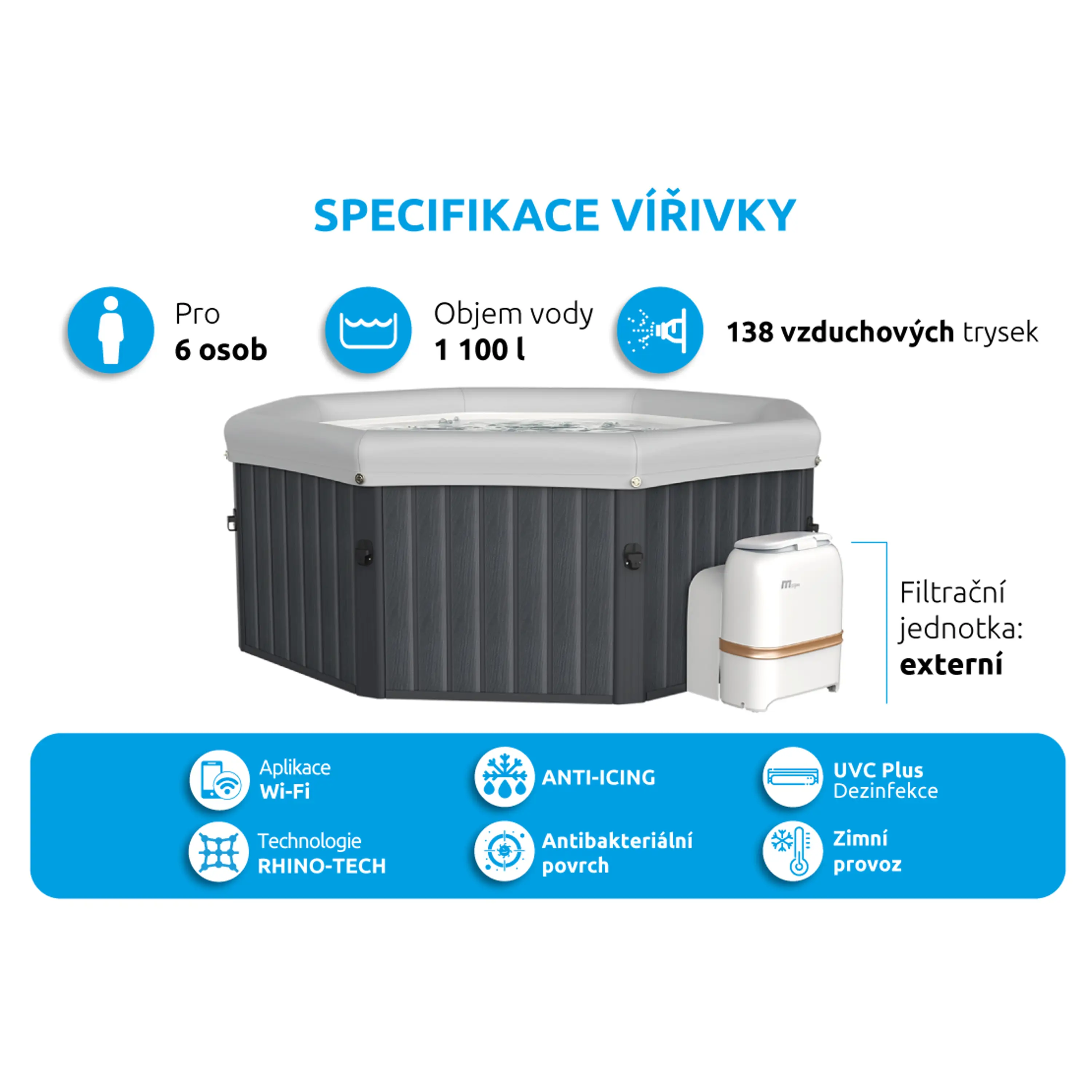 Systém ANTI-ICING bude neustále dohlížet na vaši vířivou vanu a hlídat bezpečnou úroveň teploty. Pokud teplota vody poklesne pod 1°C, ohřev se automaticky spustí, dokud teplota vody nestoupne na 3°C. Toto zabrání vodě v zamrznutí a ochrání tak cirkulační systém, čerpadlo a trubky před poškozením.