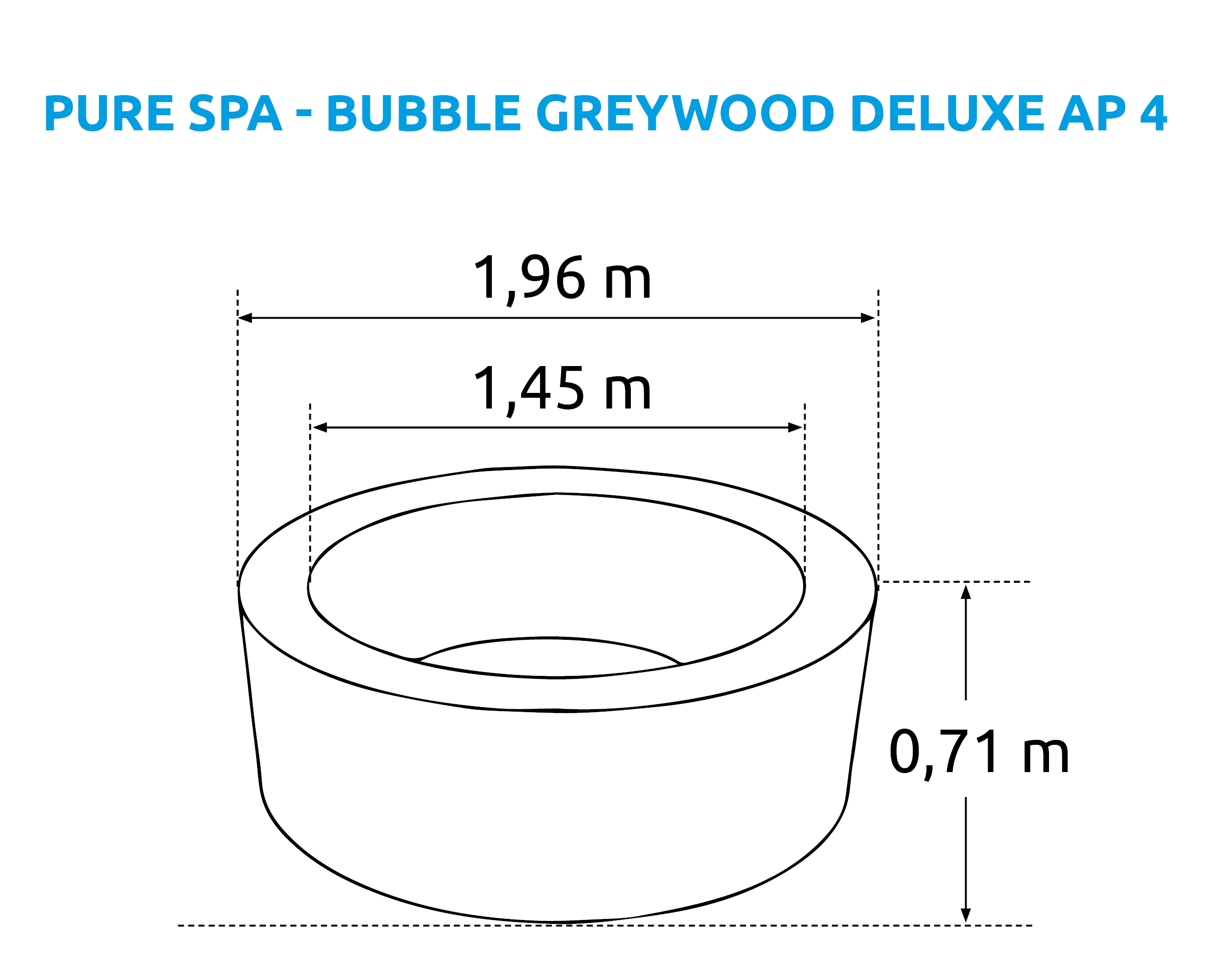 Vířivý bazén Pure Spa - Bubble Greywood Deluxe AP 4 disponuje novou funkcí Wi-Fi pro spárování a ovládání vířivky pomocí mobilního telefonu. Dalším benefitem je systémem HWT na změkčování vody poskytuje dokonalou relaxaci. Díky jejím rozměrům je vhodná až pro čtyři osoby. Vířivka má 140 vysoce výkonných bublinkových trysek, které masáží povzbudí každý sval.