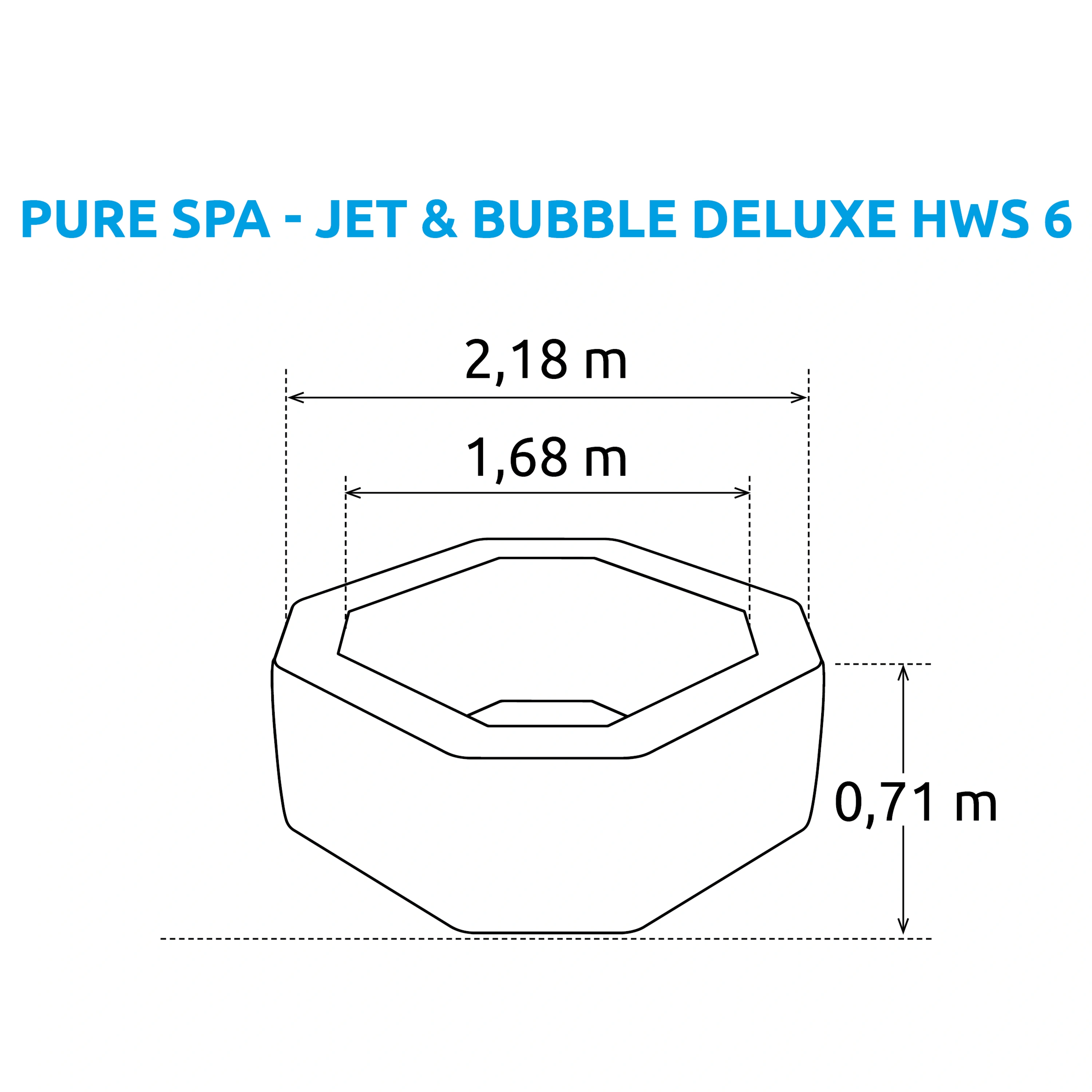 Vířivá vana PureSpa Jet & Bubble Deluxe HWS 6 disponuje novou funkcí WIFI pro spárování a ovládání vířivky pomocí mobilního telefonu. Intuitivní ovládací panel aktivuje 140 vysoce výkonných bublinkových trysek, které masáží povzbudí každý sval. Stejně tak můžete vychutnávat i silnou masáž pomocí šesti hydromasážních trysek. Integrovaný topný systém umožňuje upravit teplotu vody dle momentální nálady. Další výhodou je vestavený solinátor, který nahrazuje chlor jednoduchou nejodizovanou solí, která je šetrnější k lidské pokožce. Díky samoinstalačnímu mechanismu je instalace vířivé vany rychlá a jednoduchá. PureSpa stačí zapojit do zásuvky a sama se během okamžiku nafoukne.