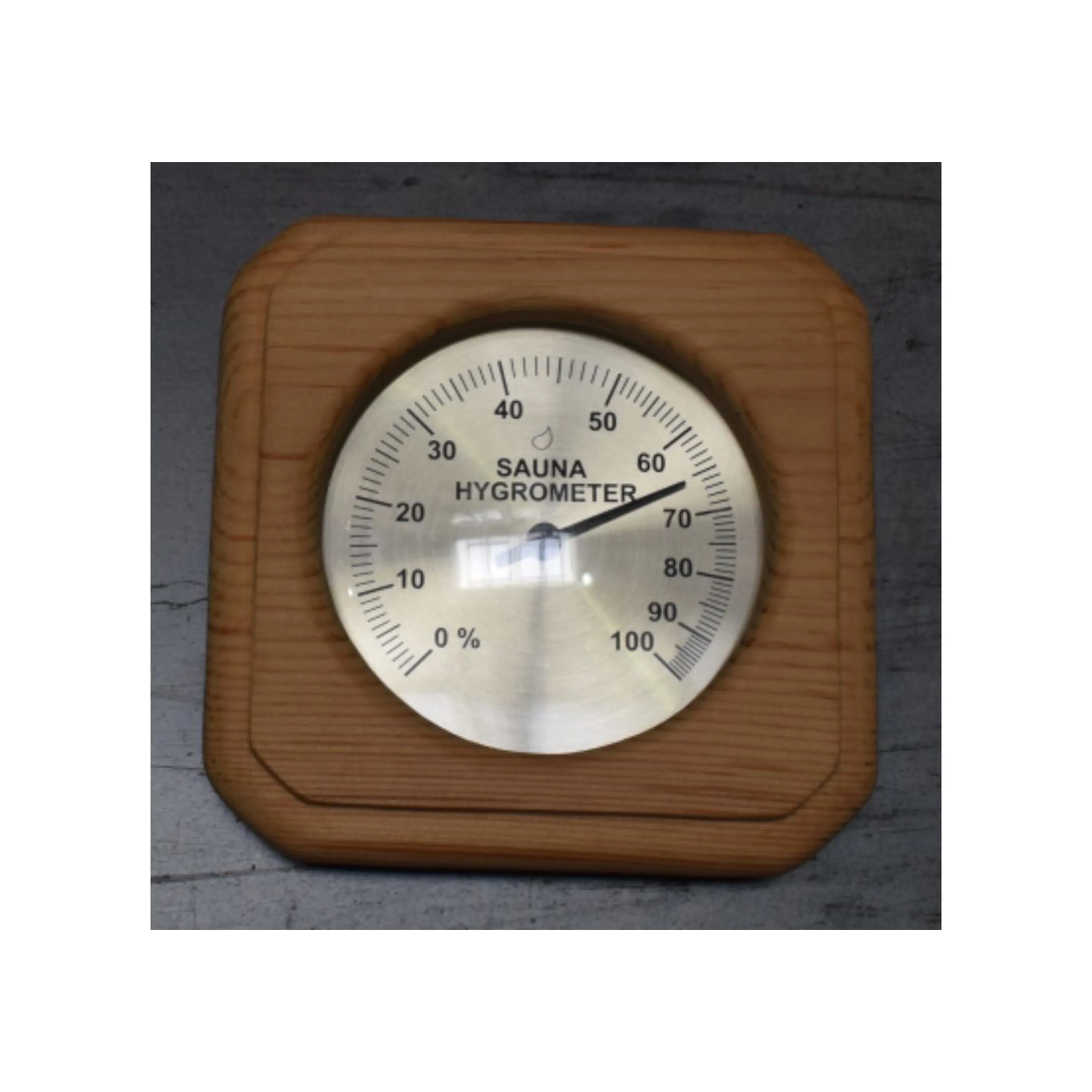 Čtvercový vlhkoměr se dřevěným rámem a kovovým ciferníkem.