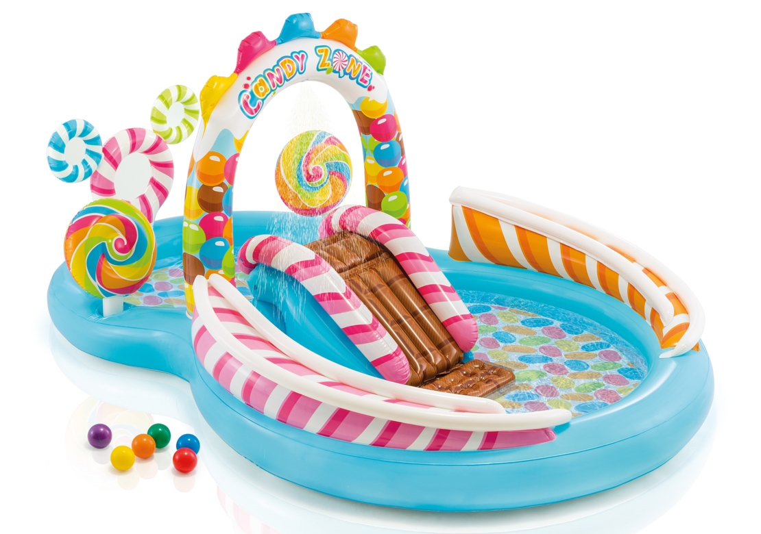 Nafukovací hrací centrum se dvěma bazénky a motivem sladkostí, se skluzavkou, sprškou, dvěma nafukovacími lízátky a šesti míčky.