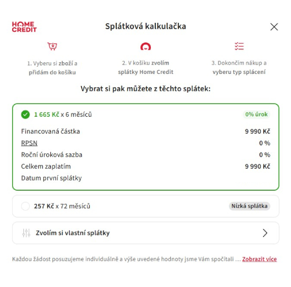 - Po odeslání objednávky budete přesměrování na webové stránky společnosti Home Credit, kde on-line dokončíte sjednání splátek.