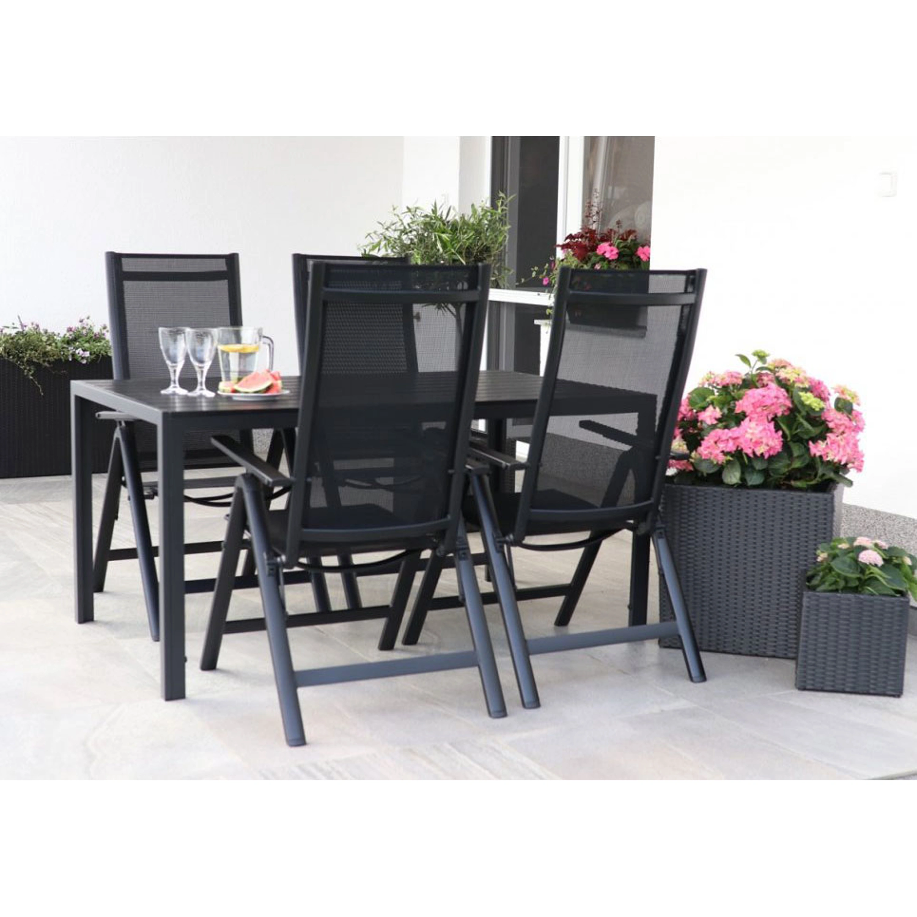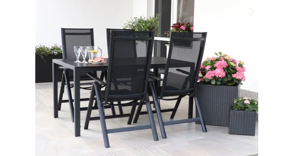 Sestava zahrnuje krásný a lehký stůl vyrobený z materiálů, které nevyžadují zvláštní údržbu. Konstrukce z hliníku ošetřeného proti rzi, deska stolu z Artwoodu a adaptéry u nohou pro větší stabilitu. Klasické tvary a černé provedení stolu.