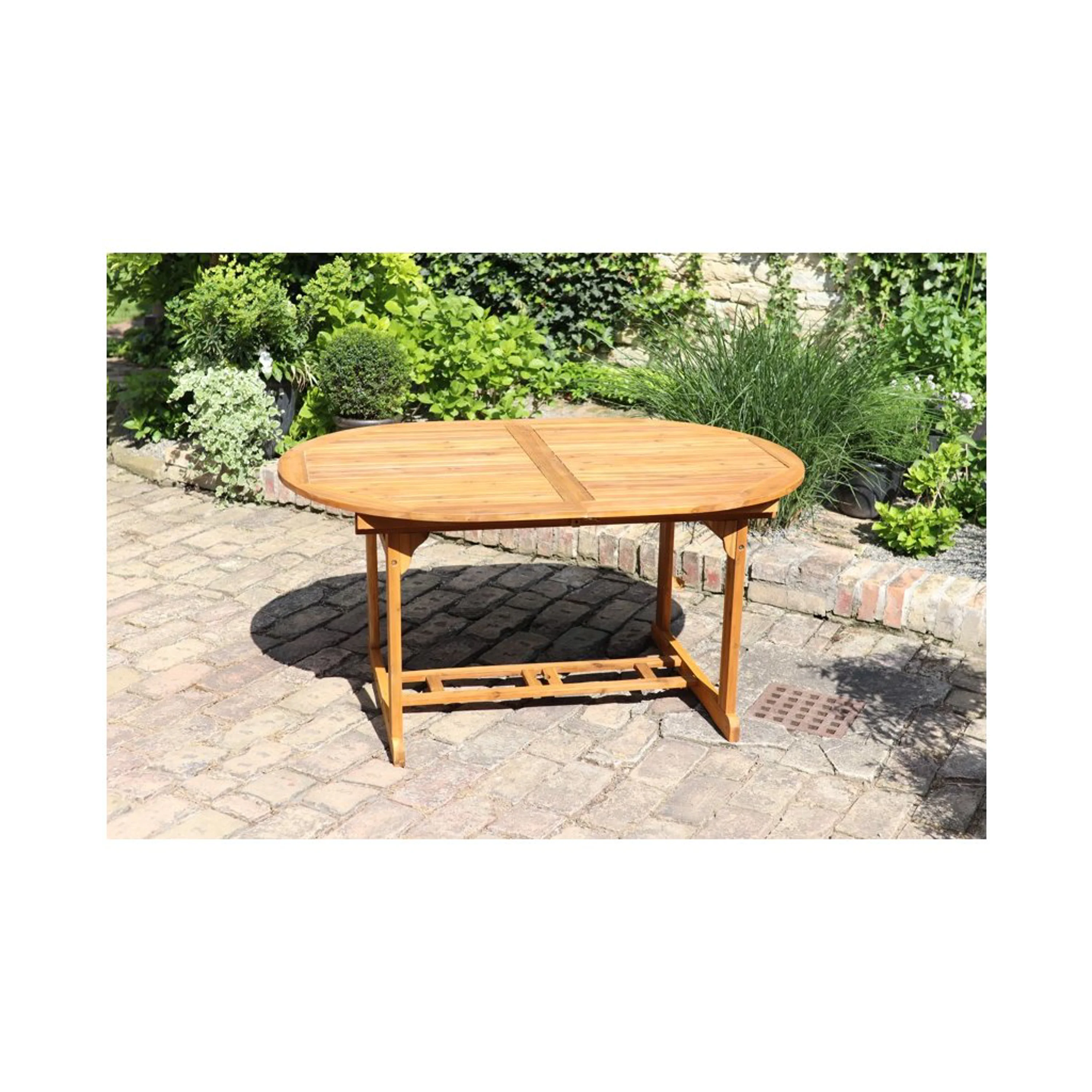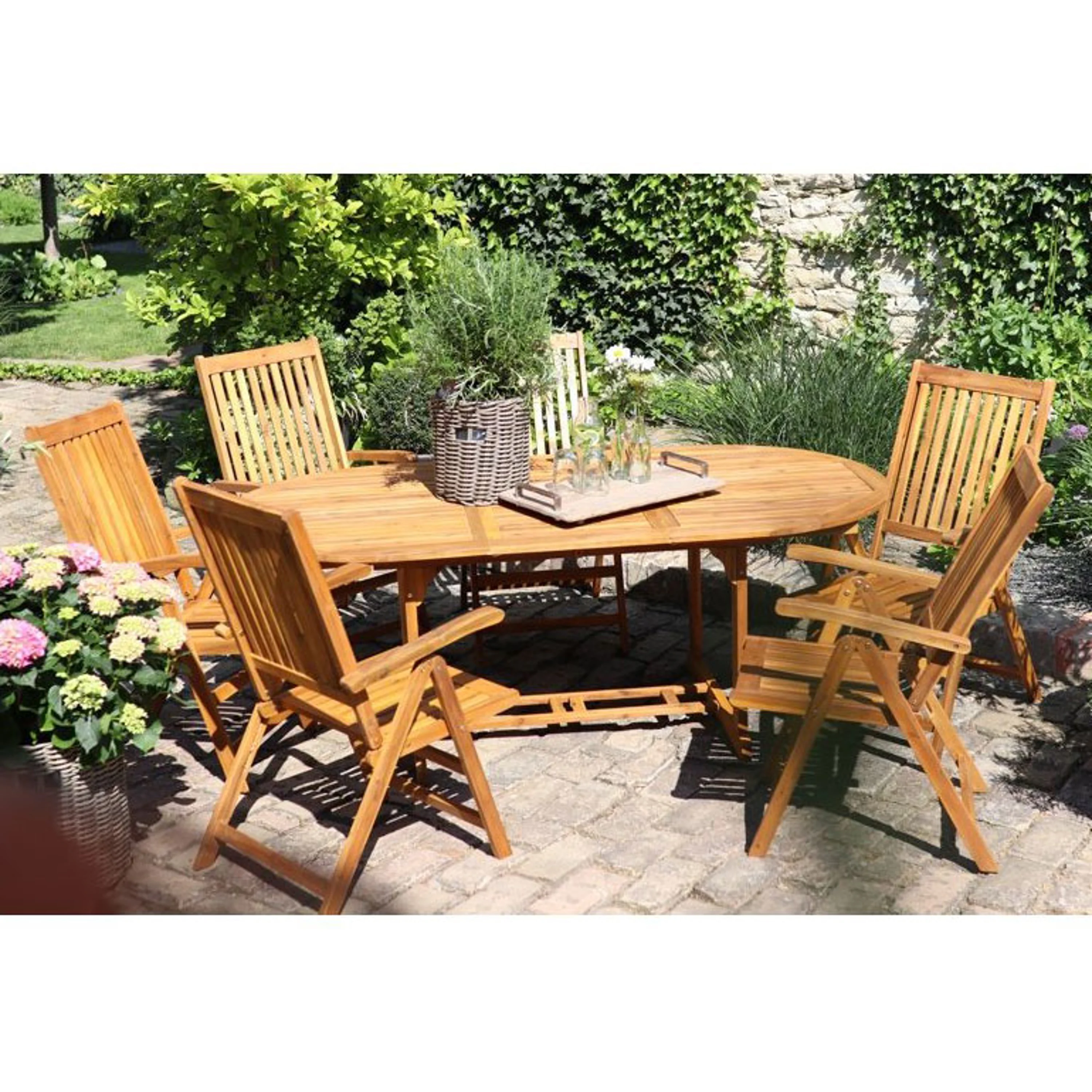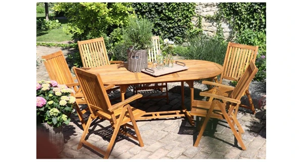 Sestava zahrnuje rozkládací oválný stůl Viet, který je vyroben z vysoce kvalitního tropického dřeva akácie. Stůl disponuje praktickým systémem rozkládání. Možnost prodloužení základní délky stolu ze 150 cm na 200 cm. Uprostřed otvor pro slunečník.