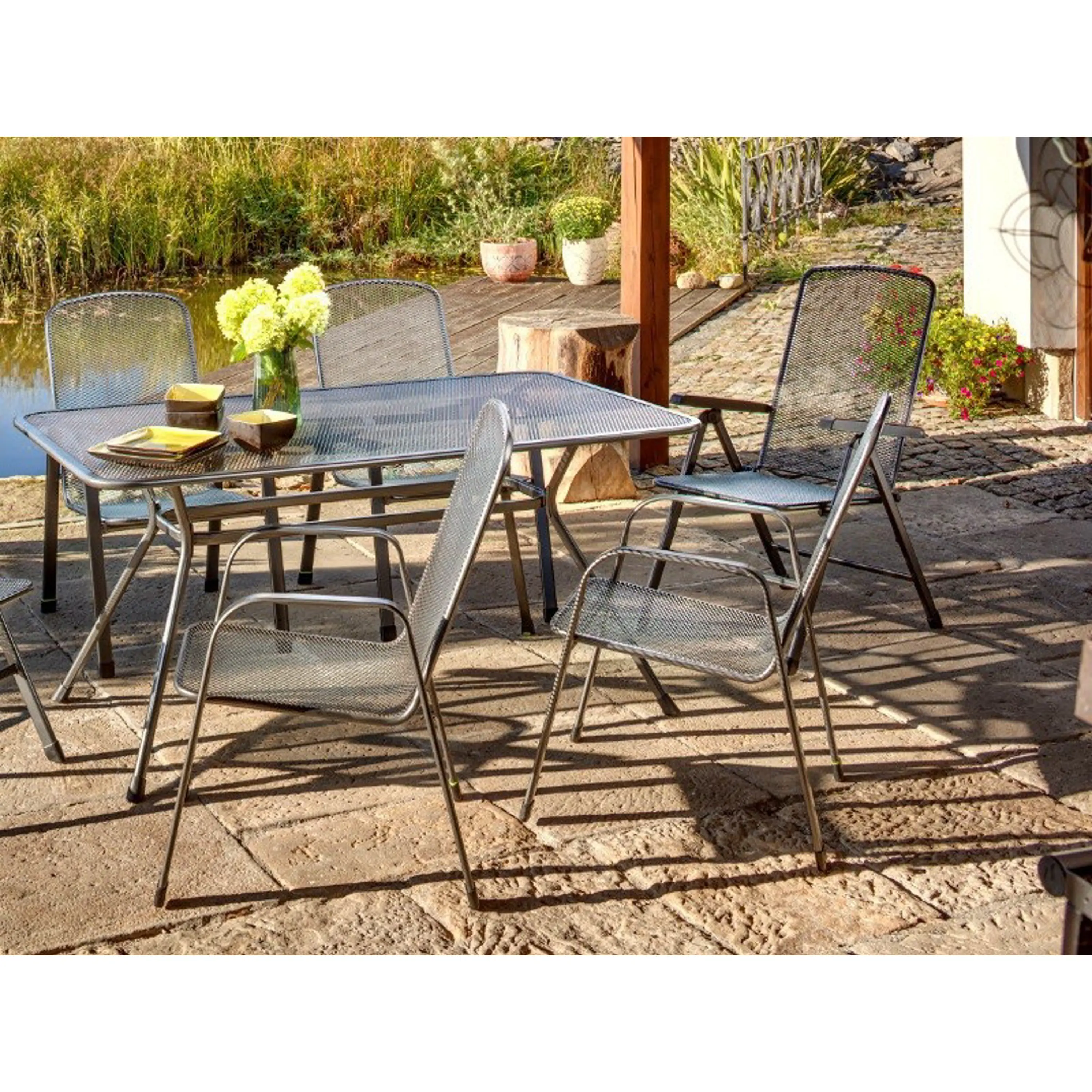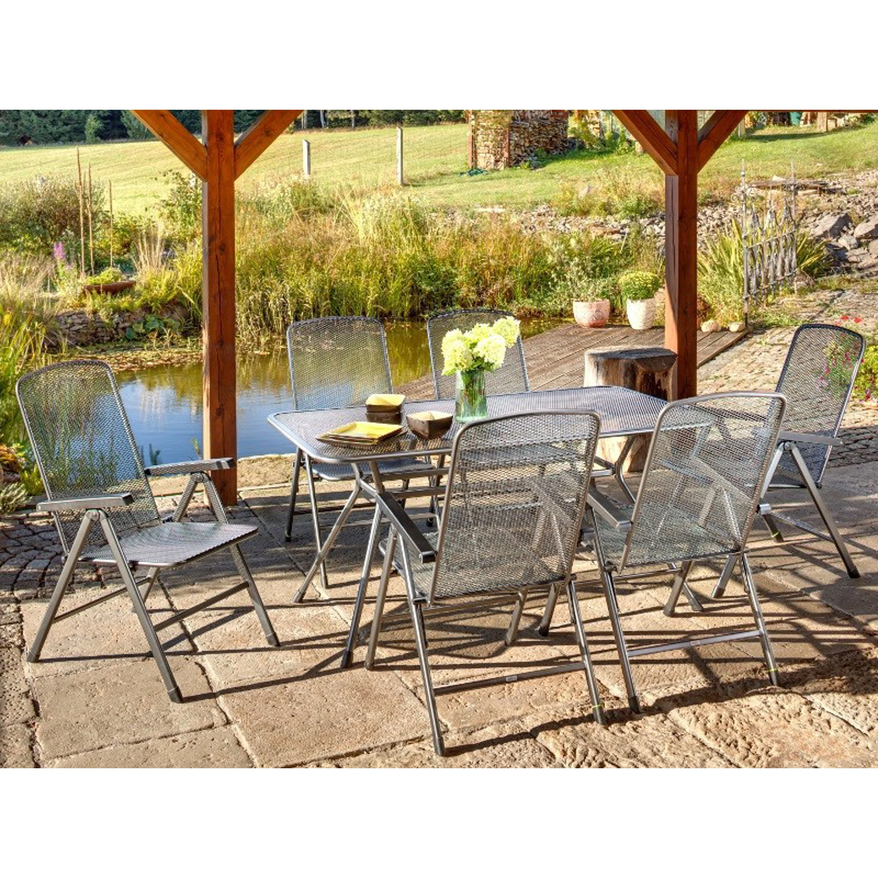Elegantní stůl Tavio s deskou s oky ve tvaru kosočtverce je vybaven pevným kovovým rámem. Stůl ve tvaru obdélníku s oblými rohy vytvoří vkusnou sestavu například v kombinaci s tahokovými křesly Savoy nebo Bameso. Nábytek odolný vůči vodě i slunečnímu záření je zcela bezúdržbový.