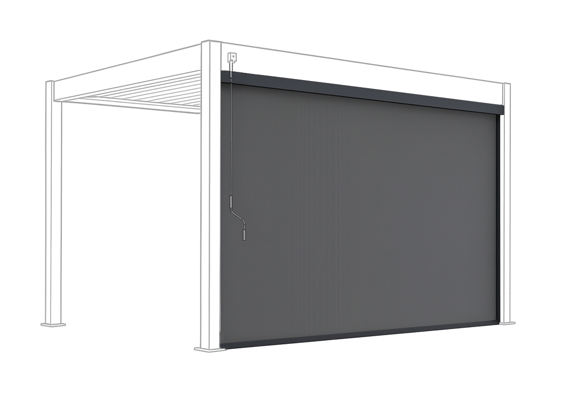 Zástěna 2,65 m pro bioklimatickou pergolu s hliníkovou konstrukcí a výplní z textilenu, která poskytne ochranu před větrem a zároveň vytvoří i příjemný stín.