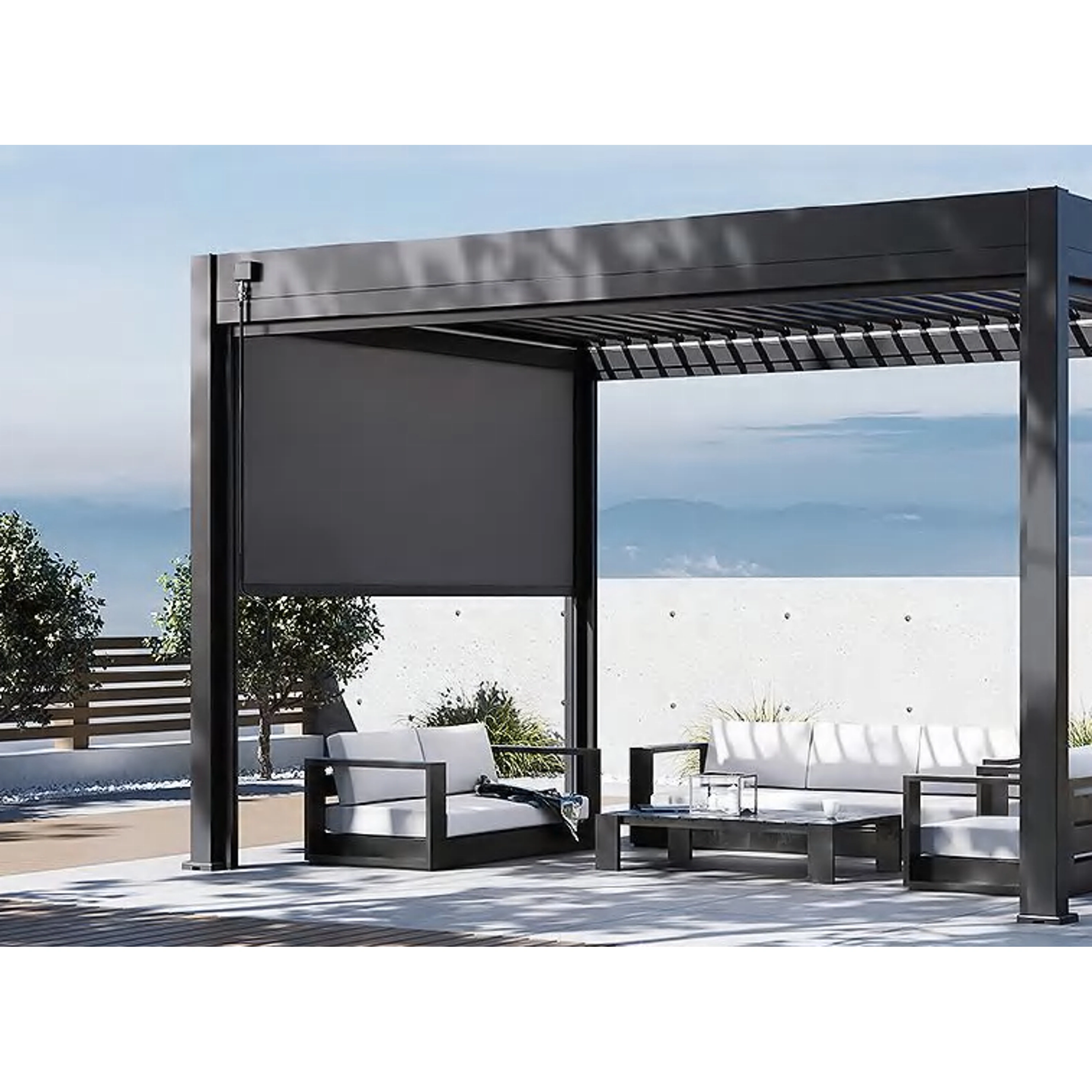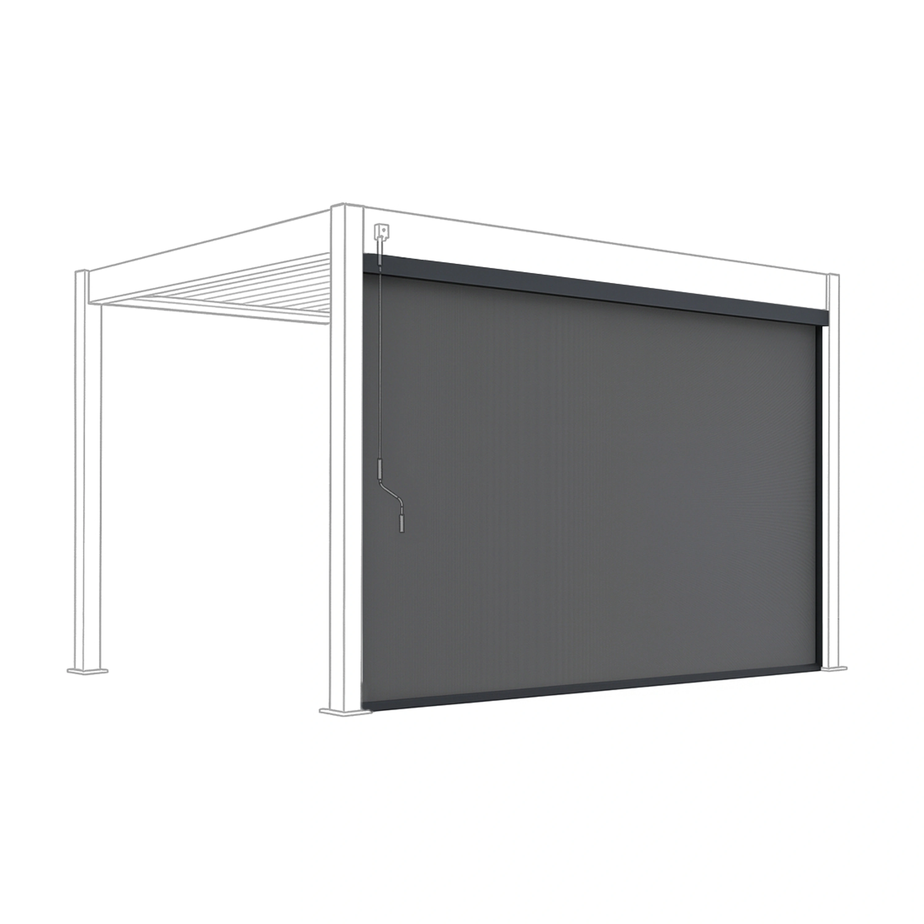 Zástěna 2,65 m pro bioklimatickou pergolu s hliníkovou konstrukcí a výplní z textilenu, která poskytne ochranu před větrem a zároveň vytvoří i příjemný stín.