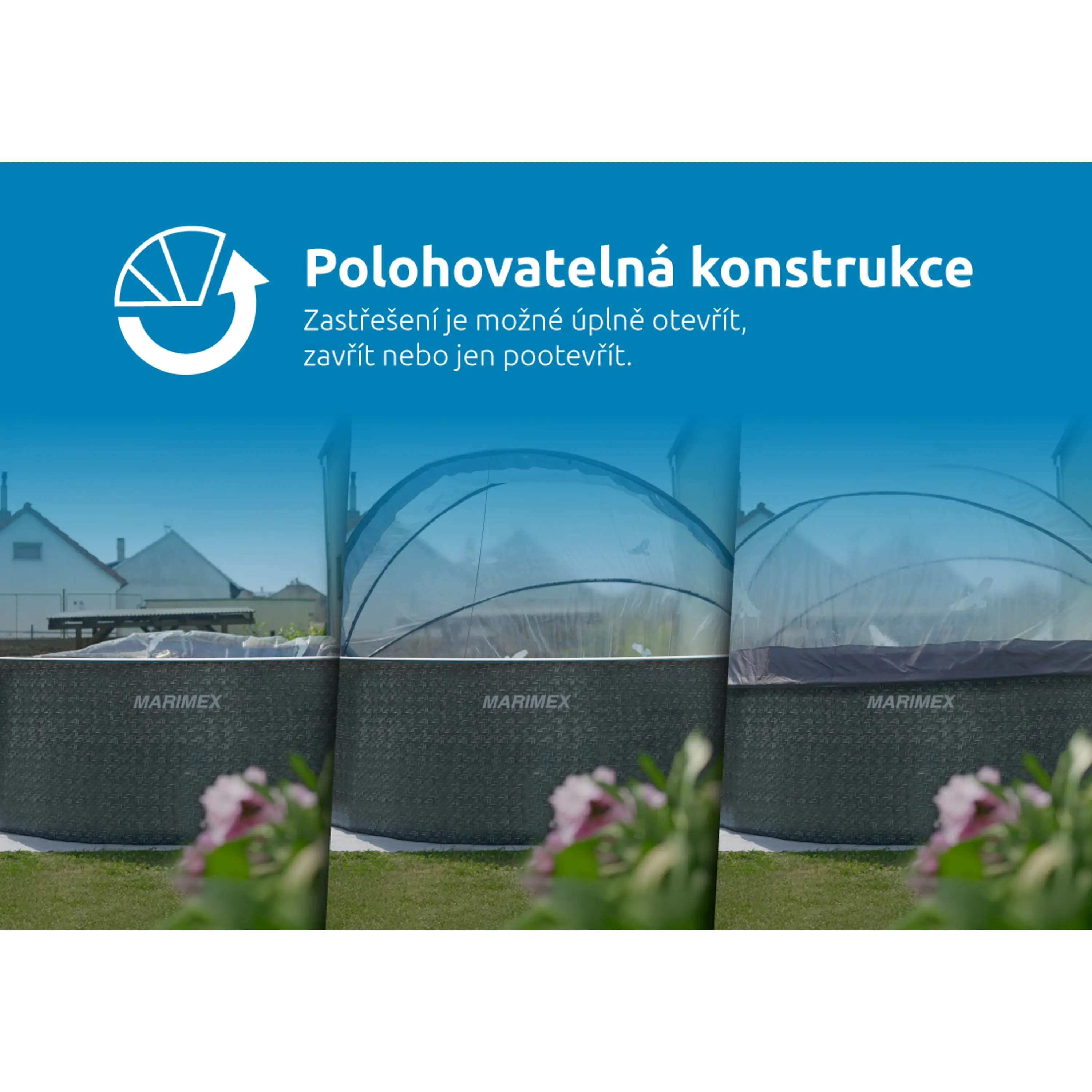 Zastřešení je možné polohovat. Mimo úplného zavření a úplného odkrytí bazénu, může být zastřešení i částečně pootevřené. Více informací o této funkci se dozvíte ZDE (dokument PDF).