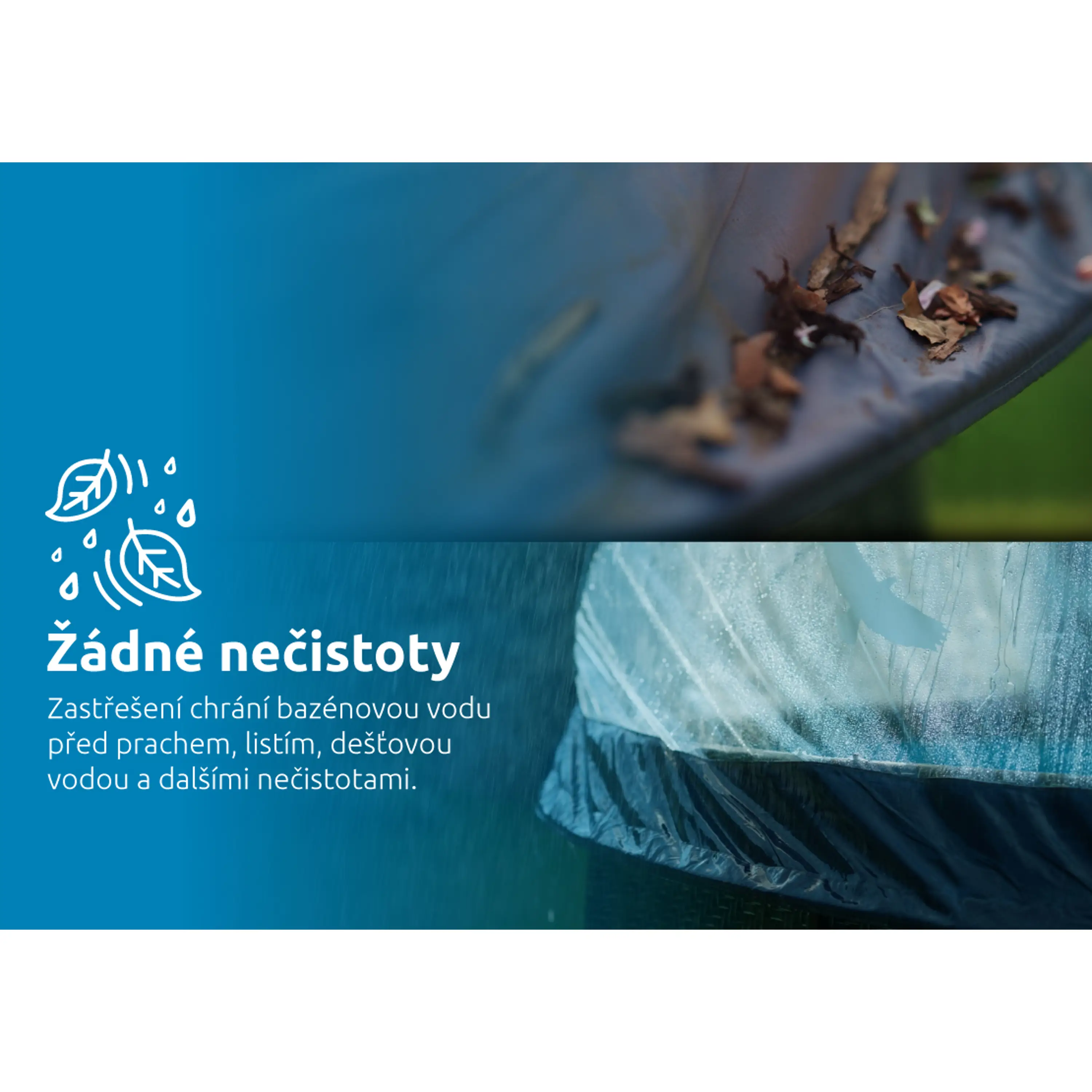 Ochrana bazénu i vodyZastřešení chrání bazénovou vodu před spadem nečistot a snižuje tepelné ztráty. Zároveň zabraňuje přímému působení UV záření na materiál bazénu a vodu. |
