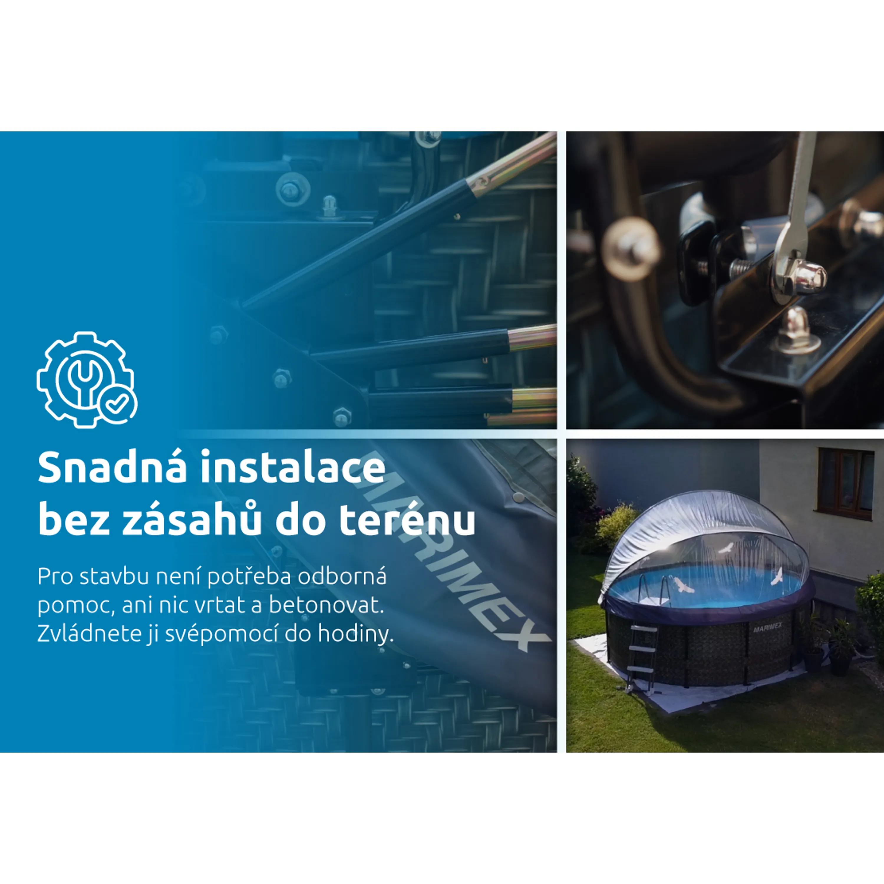 Bez stavebních úpravMontáž se obejde bez jakýchkoliv stavebních úprav. Zastřešení se snadno instaluje na většinu běžných rámových bazénů. Pouze se připevní na rám a rozvine. |